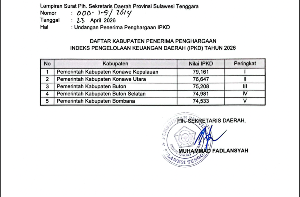 Diketahui, berdasarkan dokumen tersebut, Pemerintah Kabupaten Konawe Kepulauan berhasil menempati posisi pertama dengan nilai IPKD sebesar 79,161. Capaian ini menempatkan Konawe Kepulauan sebagai daerah dengan kinerja terbaik dalam pengelolaan keuangan daerah di Provinsi Sulawesi Tenggara tahun ini.