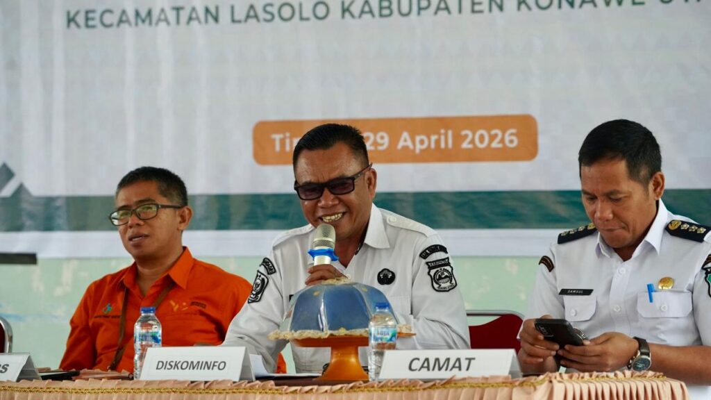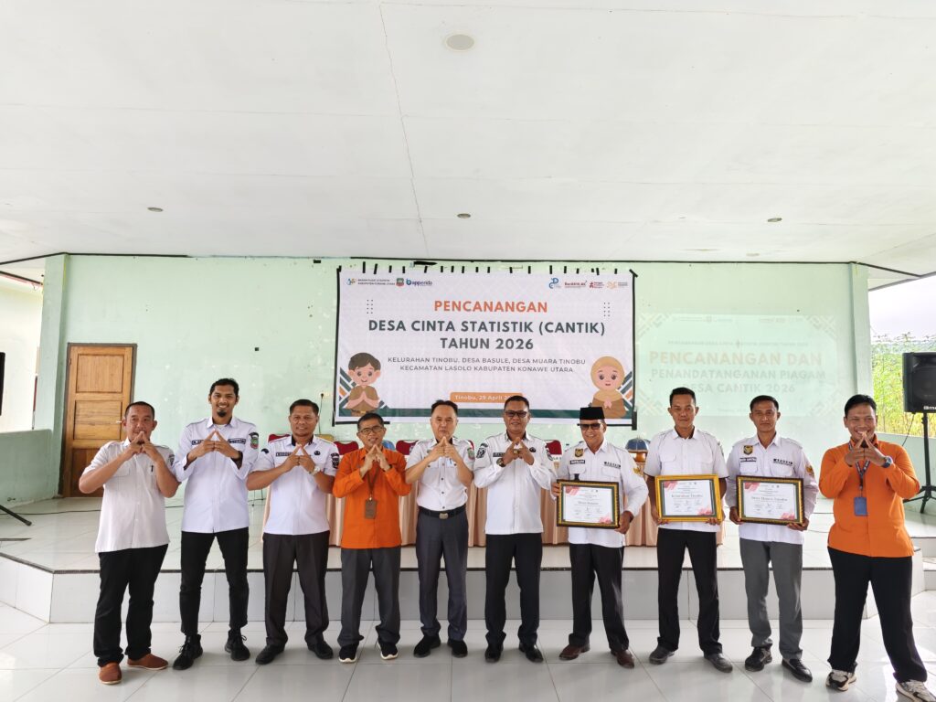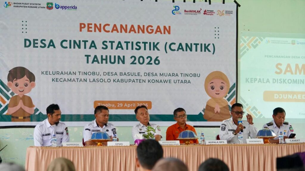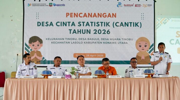 LASOLO (29/04/2026) – (Pemda) Kabupaten Konawe Utara memperkuat sinergitas bersama Badan Pusat Statistik (BPS) melalui Pencanangan Desa Cinta Statistik (Desa Cantik). Asisten III Sekretariat Daerah secara resmi membuka kegiatan Pencanangan Desa Cinta Statistik (Desa Cantik) hari ini di Aula Kantor Kecamatan Lasolo. Kegiatan kolaboratif bersama Badan Pusat Statistik (BPS) ini menyasar tiga lokus utama: Kelurahan Tinobu, Desa Basule, dan Desa Muara Tinobu.Kegiatan dibuka langsung oleh Asisten III Setda Konawe Utara, Amrun, S.P., M.M., mewakili Bupati Konawe Utara. Dalam sambutannya, Amrun menegaskan pentingnya akurasi data dari tingkat desa sebagai dasar pengambilan kebijakan pemerintah daerah. Acara ini dihadiri pula oleh sejumlah pejabat penting, di antaranya Kepala Dinas Komunikasi dan Informatika (Diskominfo) Djunaedy, S.Pd., M.Si, Kepala Bapperida, Dinas BPMD Konawe Utara, serta Camat Lasolo. Hadir pula para Kepala Desa, Lurah, tokoh masyarakat, dan warga setempat.